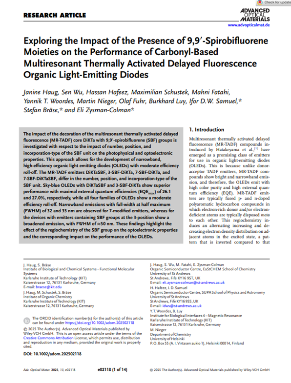 Janine Haug, Sen Wu, Hassan Hafeez, Maximilian Schustek, Mahni Fatahi, Yannik T. Woordes, Martin Nieger, Olaf Fuhr, Burkhard Luy, Ifor D.W. Samuel, Stefan Bräse, and Eli Zysman-Colman, Adv. Optical Mater. 2025, 13, e02118.