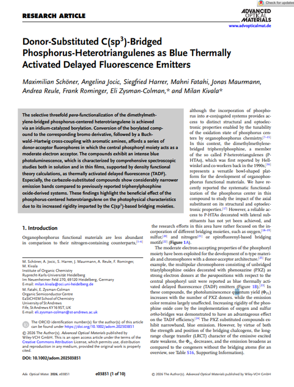 Maximilian Schöner, Angelina Jocic, Siegfried Harrer, Mahni Fatahi, Jonas Maurmann, Andrea Reule, Frank Rominger, Eli Zysman-Colman, and Milan Kivala, Adv. Sensor Res., Adv. Optical Mater. 2026, e03851.